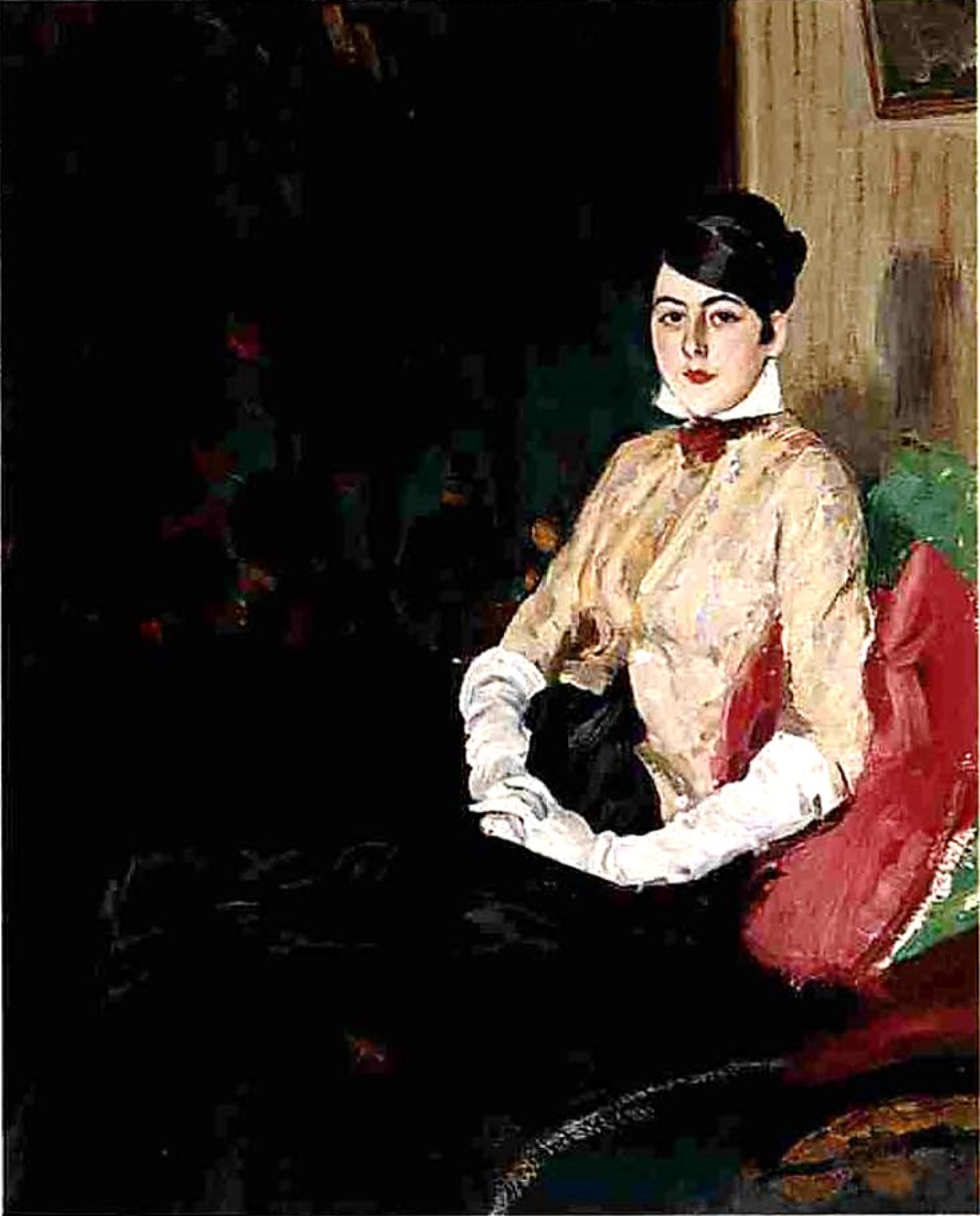 3/4 portrait in a seated position, hands folded on her thighs, head turned toward the viewer, looking directly at him. The subject wears a black skirt, a gold-colored brocade jacket with long side panels, a white blouse with a stand-up collar and a wine-red bow, and long white gloves reaching to the elbows. She leans on red and green cushions draped over a sofa. Background: a salon, only the right wall of which is illuminated by light, on which the shadow of the sitter is visible; above it, part of a picture on the wall is also visible.