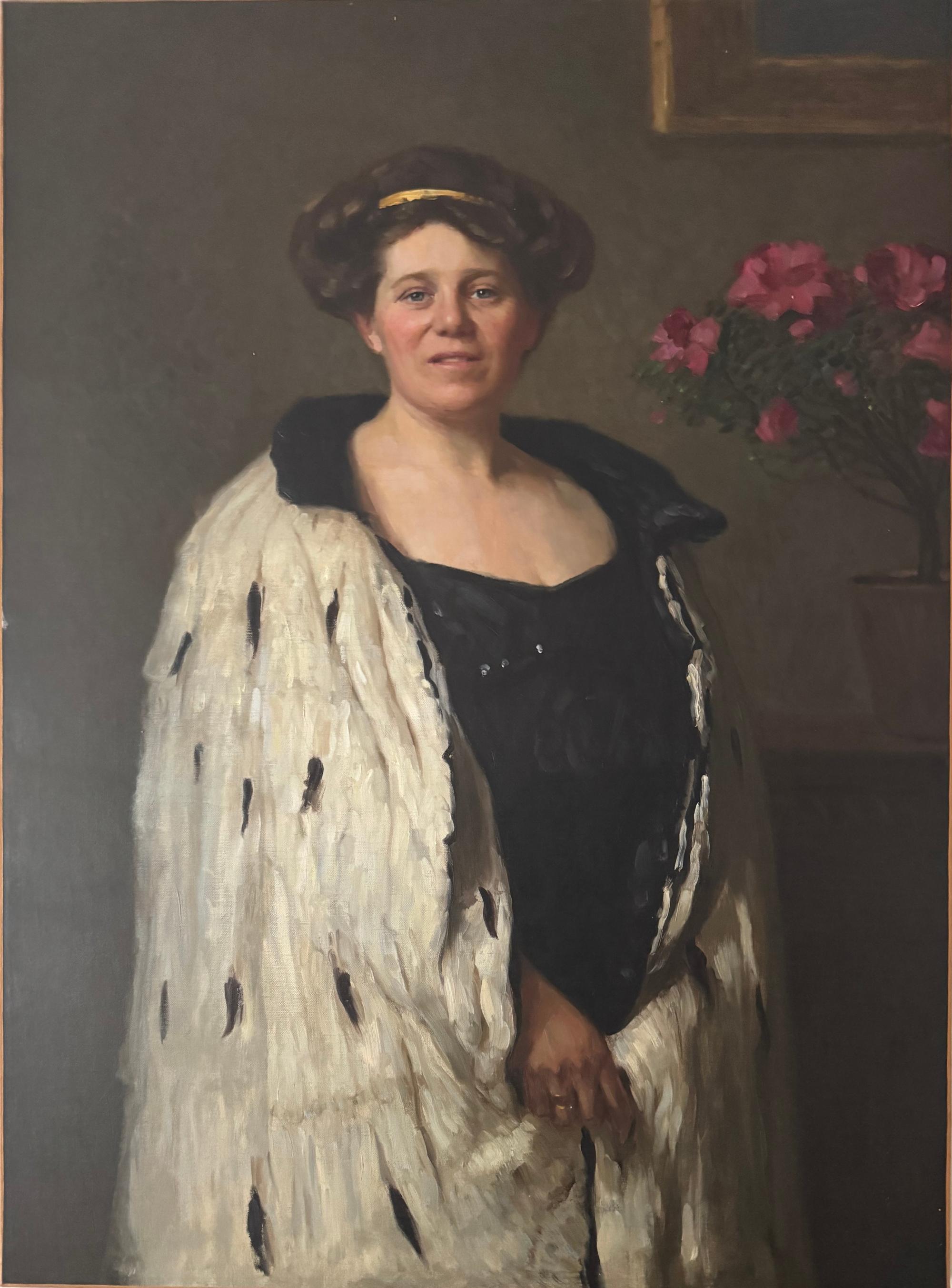 The portrait, which is dated to around 1908-1910 based on family photographs of the subject, is not signed or dated, but is attributed to John Quincy Adams based on stylistic features and archival references. An unspecified color photograph of the painting has been preserved in the Adams file in the Künstlerhaus archive (and has been recorded previously in this catalogue under the number P_0_410), and was therefore attributed to the artist by the archivist. There is also a reference to an Adams portrait of Fanny Mondschein and its location in the USA in the written estate of Harriet Walderdorff (the artist's daughter) preserved in the Künstlerhaus archive. However, an unsigned Adams portrait is extremely rare. It is possible that the signature was removed due to damage during the restoration of the painting in the USA (it was mounted on a new stretcher frame and the damaged areas were retouched). However, it is also quite possible that Adams did not sign the painting, contrary to his usual practice. The reason for this would probably be the ermine cape depicted, which in the portrait canon of the time was reserved as a distinguishing feature for ruling dynasties. In 1908, Adams made his breakthrough as a portrait painter with his portrait of Prince Johann II of Liechtenstein, which was soon followed by numerous commissions from the high aristocracy and the German and Austrian imperial families. Adams' aristocratic clientele would certainly have found the depiction of a bourgeois furrier's daughter in ermine both inappropriate and presumptuous. An unsigned portrait would therefore not have compromised the aspiring artist or jeopardized his social advancement [the editor].