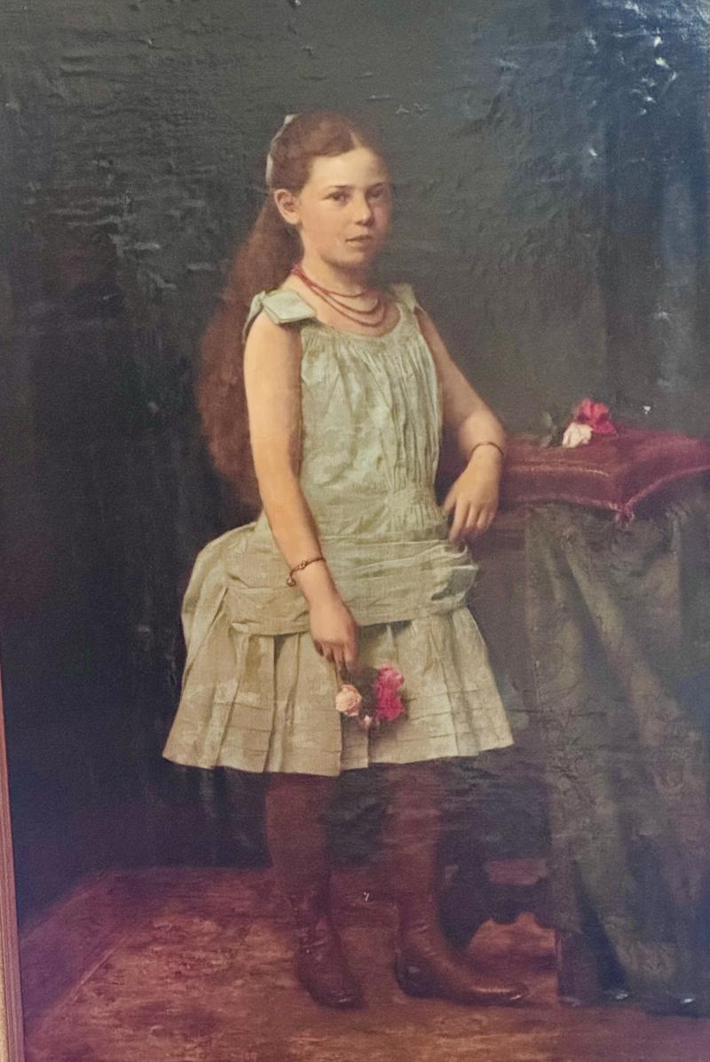 As the only child of well-to-do parents (and grandparents), Fanny Toch lived a privileged childhood. At the age of about eight, Josef and Eugenie commissioned an oil portrait of her by an unknown artist, dressed in the fashion for a young girl of the late 1880s: a teal-colored knee-length dress with a small bustle, brown tights, brown leather ankle -height boots and a coral necklace (see cross-references).